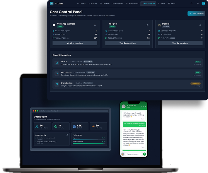 Simply text your AI manager (via WhatsApp, Telegram, Discord, or the dashboard). Send a photo, video, or command and instantly get posts, captions, images, or videos generated and ready to publish.