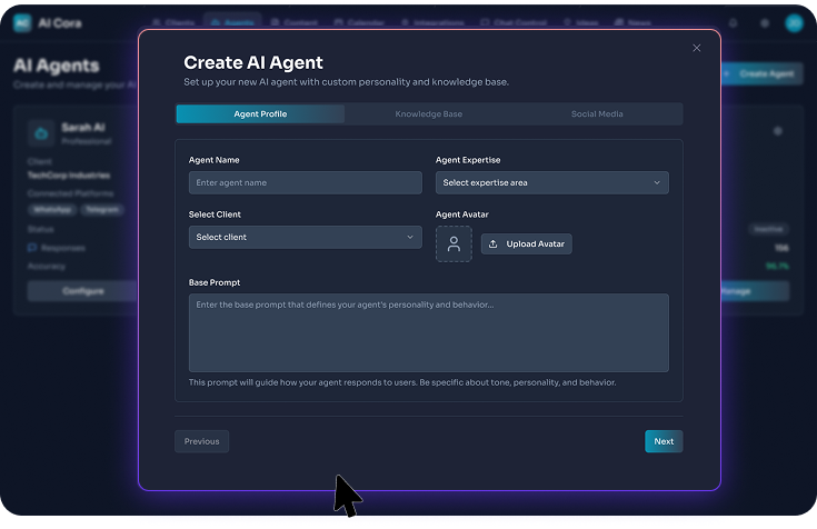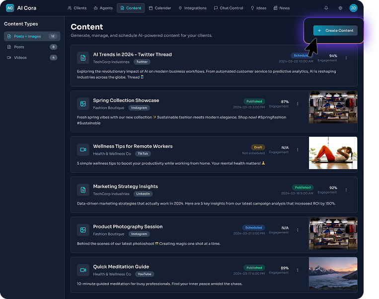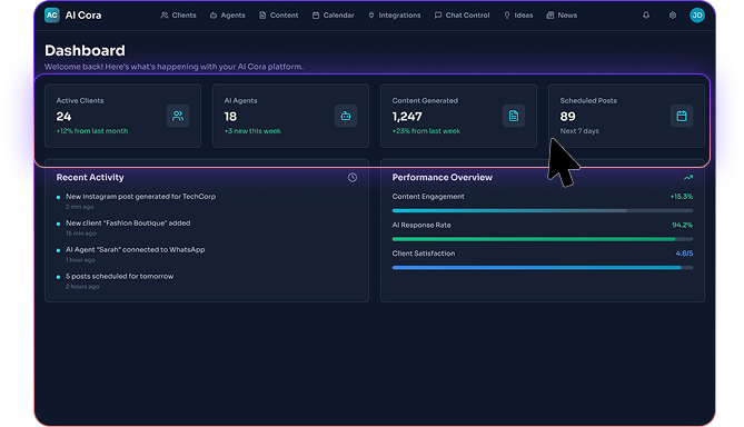 With AICora, you can launch that type of social media agency in minutes, complete with AI Social Media Managers who create posts, graphics, and videos, publish across every platform, and even track analytics automatically.