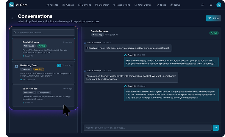 Monitor conversations, engagement, and messages across platforms from one central panel no more switching tabs or missing replies.