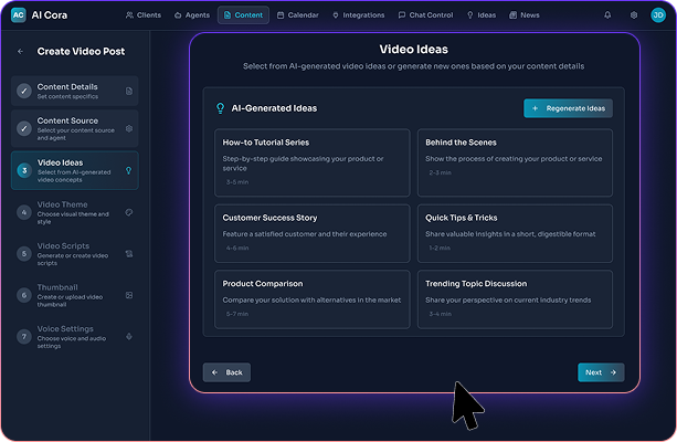 From scripts to thumbnails, your AI handles every step of video content creation. Users can publish professional-looking videos in minutes, no editing required.