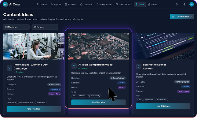 AI suggests trending topics, viral formats, and creative angles so users can post what’s hot right now and stay ahead of competitors