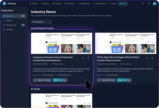 Stay on top of trends with a built-in news feed that curates industry-specific updates, giving you endless fresh content ideas.